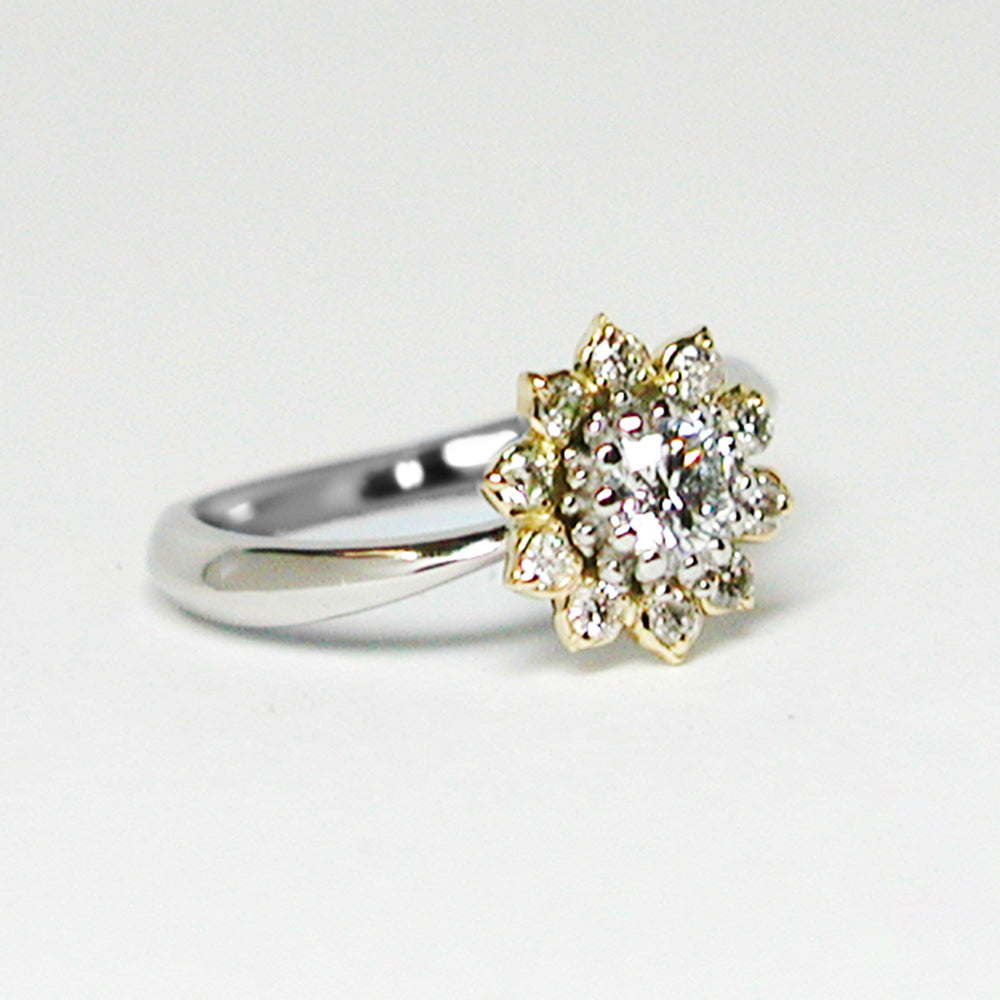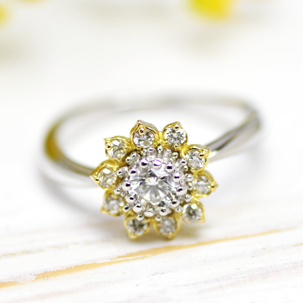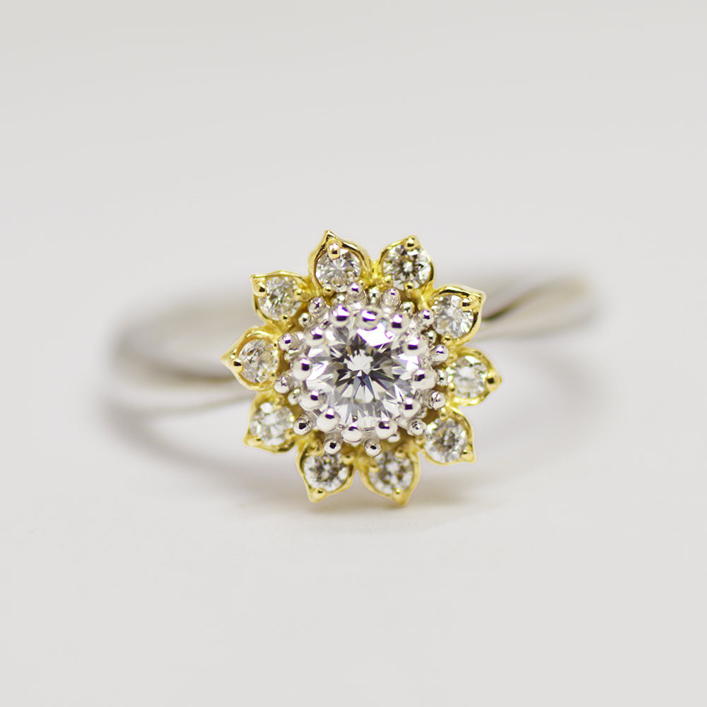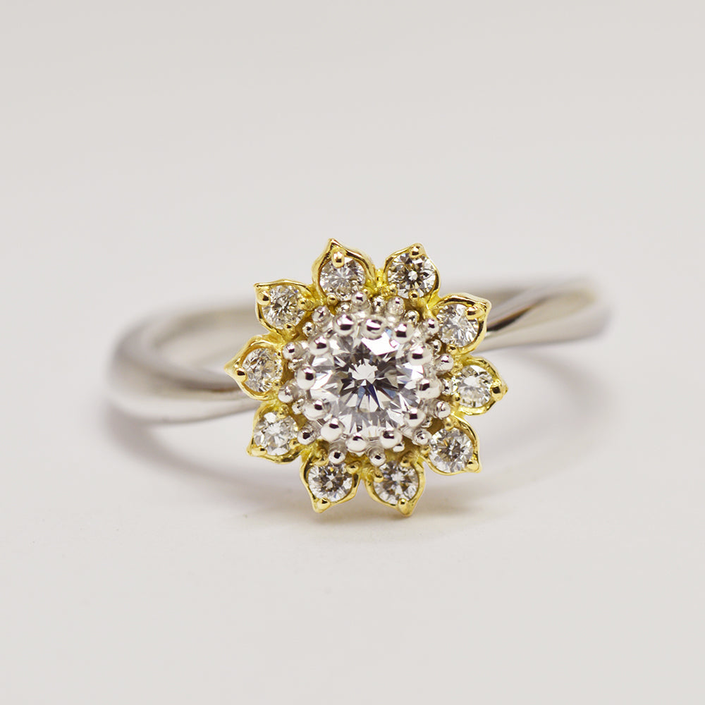 太陽に向かって咲く大輪のヒマワリのカタチをした婚約指輪。 デザインはイエローゴールドの花びらに10個のメレダイヤモンドをセッテイング。 メインダイヤモンドのひまわりには繊細な花芯をプラチナで丁寧に作り上げている。ゆるやかなウェーブラインで指長効果◎
