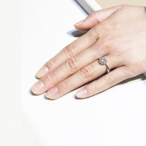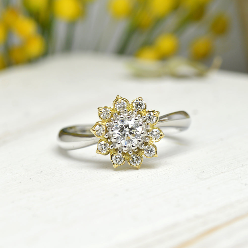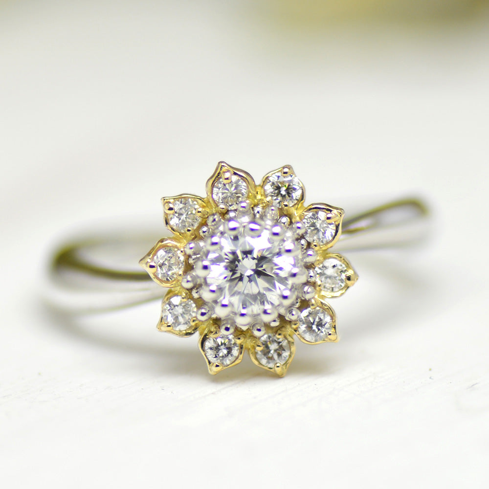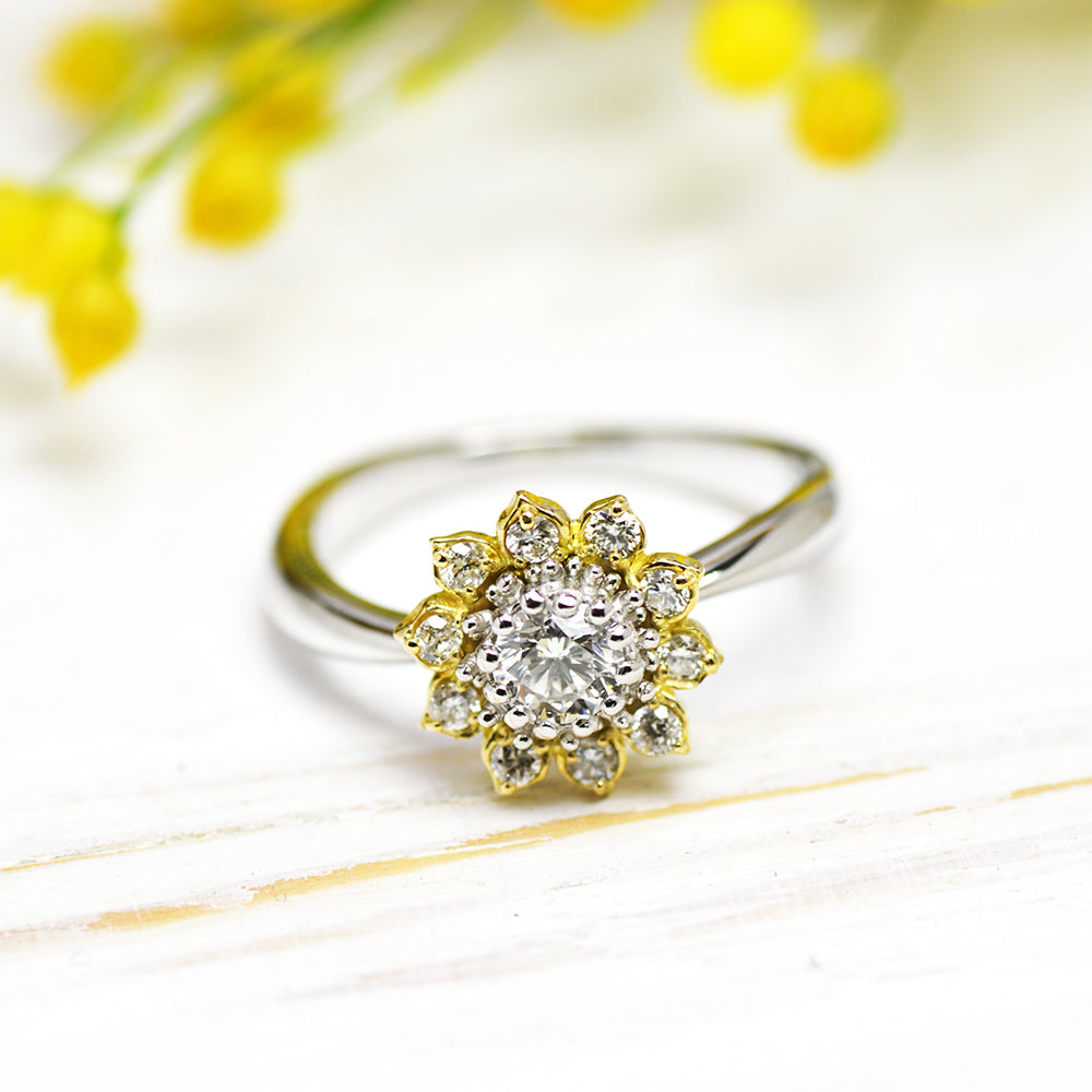 太陽に向かって咲く大輪のヒマワリのカタチをした婚約指輪。 デザインはイエローゴールドの花びらに10個のメレダイヤモンドをセッテイング。 メインダイヤモンドのひまわりには繊細な花芯をプラチナで丁寧に作り上げている。ゆるやかなウェーブラインで指長効果◎