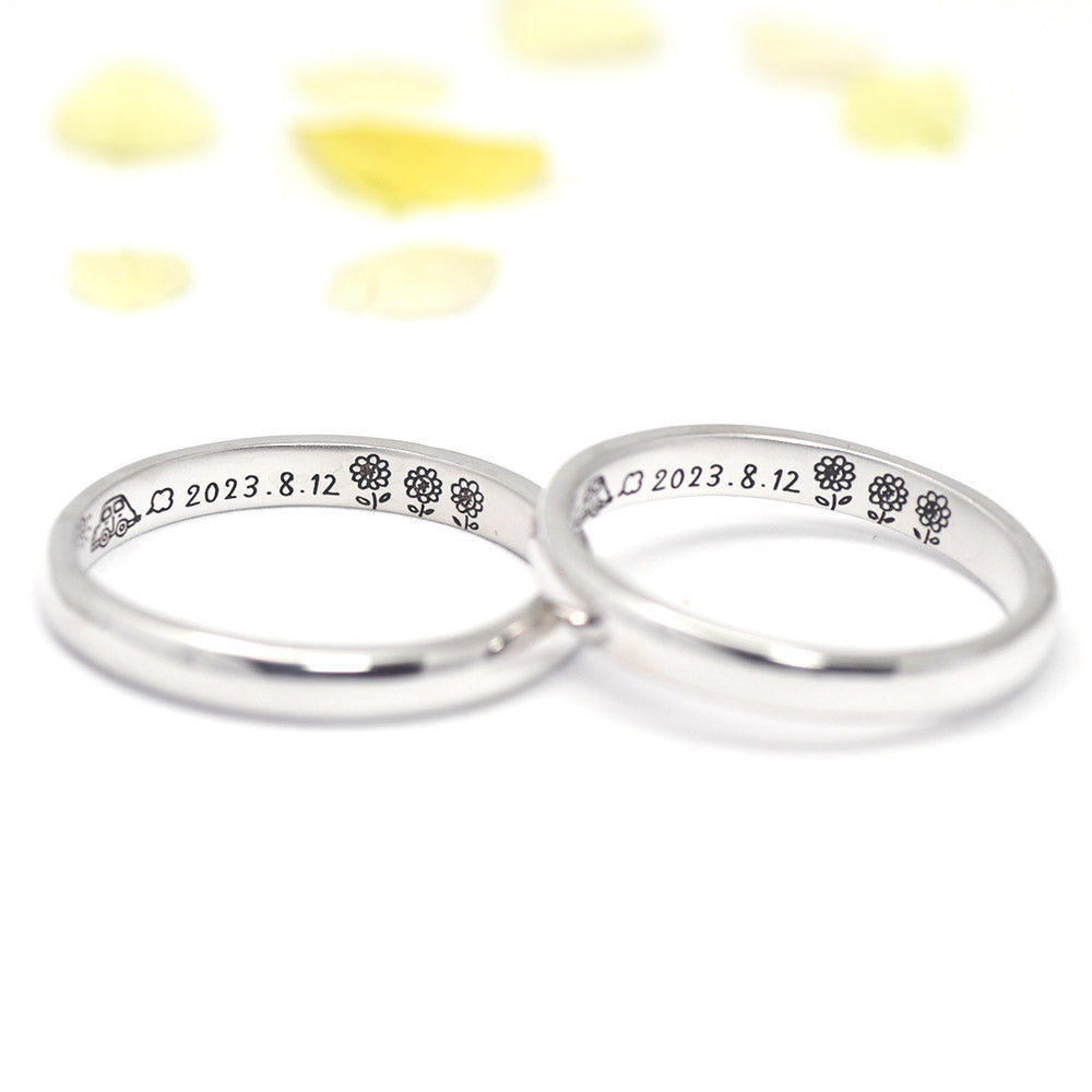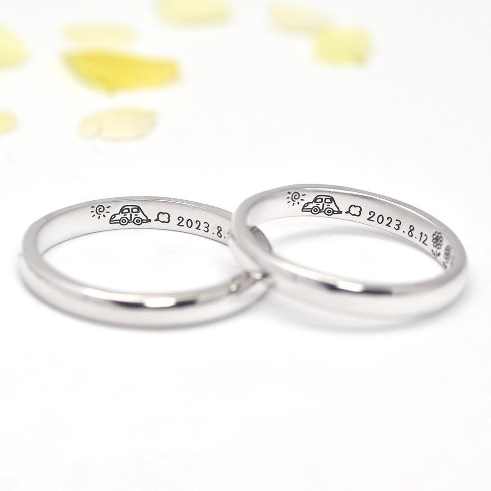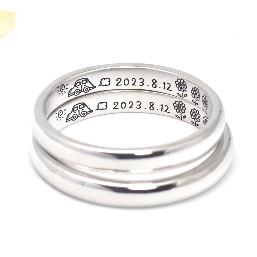 選んでいただいたリングの内側に、お客様ご自身で手描きしたイラストや文字彫刻をできる結婚指輪です。女性用リング、男性用リング、それぞれ1つずつ画像をアップしてください。