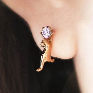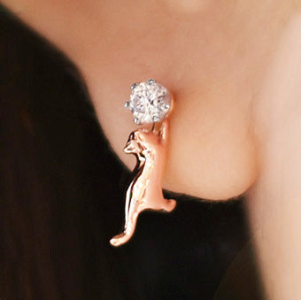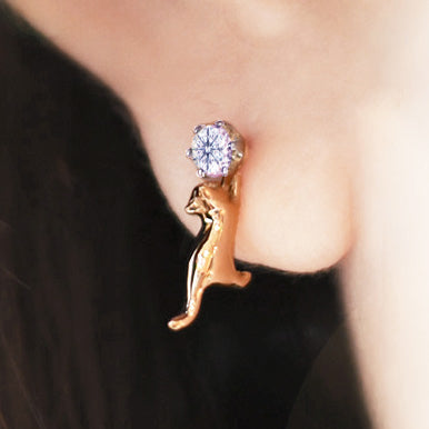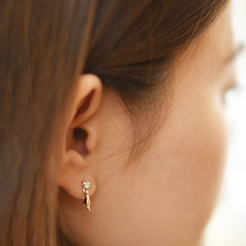 耳に抱きつきポーズで愛らしい猫。2wayタイプの片耳ピアス。猫ちゃんがお家でお留守番の時は1粒ダイヤモンドンピアスとしても使えます。