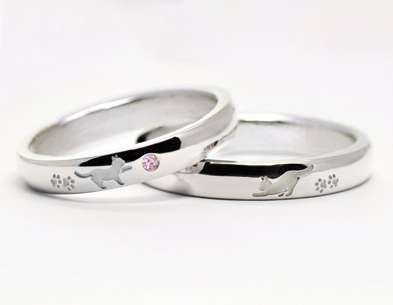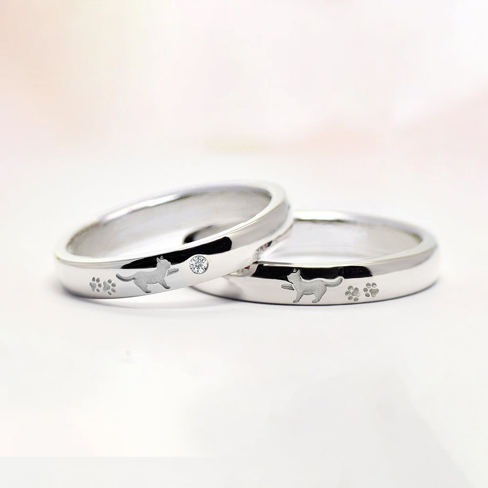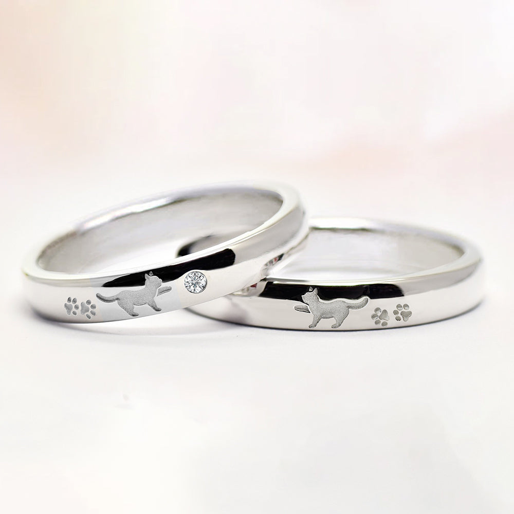 タッチしようと前足を伸ばしている好奇心いっぱいの猫ちゃん、ちょこんとお座り、伸びの3つから好きなポーズを選らんでオーダー可能。かわいい肉球も無料でプラスできます。オプションで好きな色のダイヤモンドや内側刻印も可能。