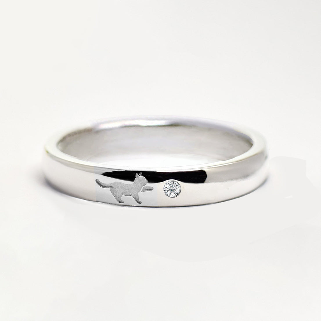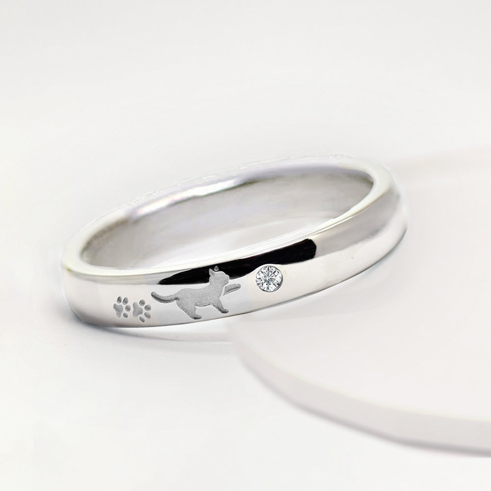 タッチしようと前足を伸ばしている好奇心いっぱいの猫ちゃん、かわいい肉球も無料でプラスできます。オプションで好きな色のダイヤモンドや内側刻印も可能。