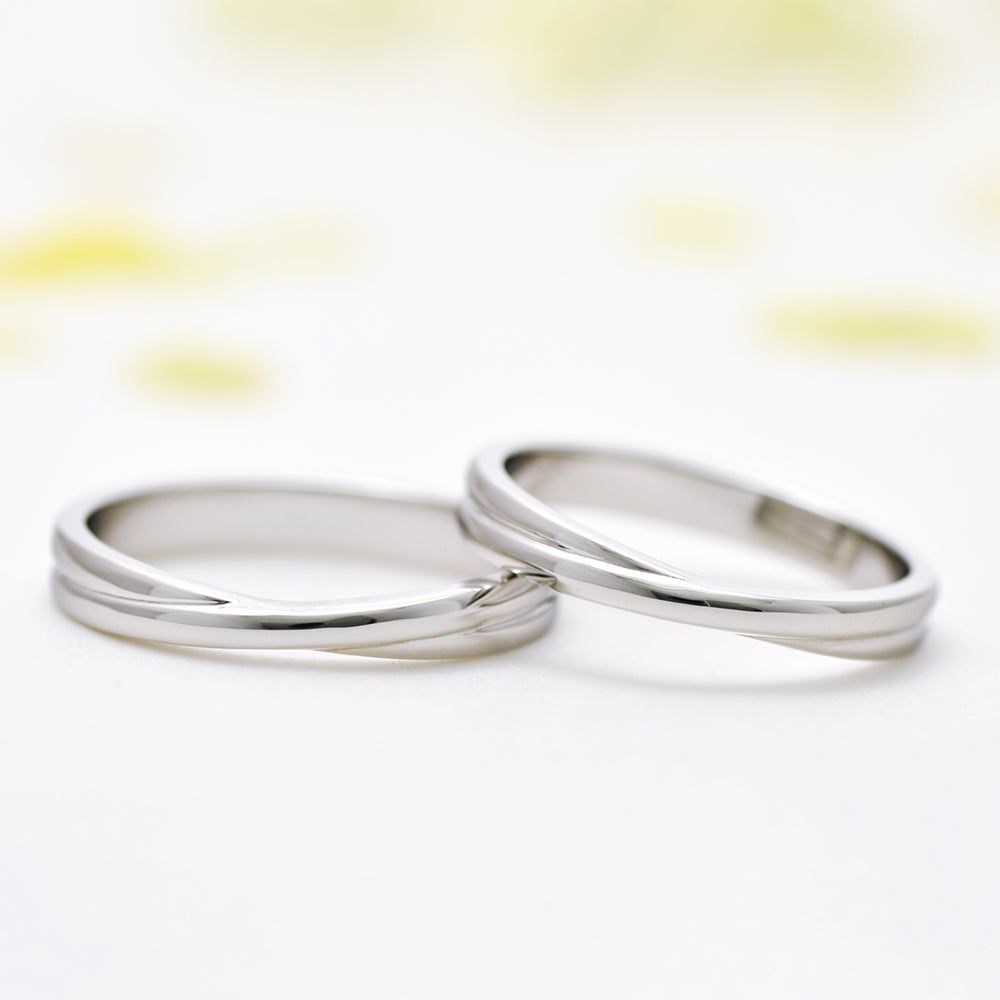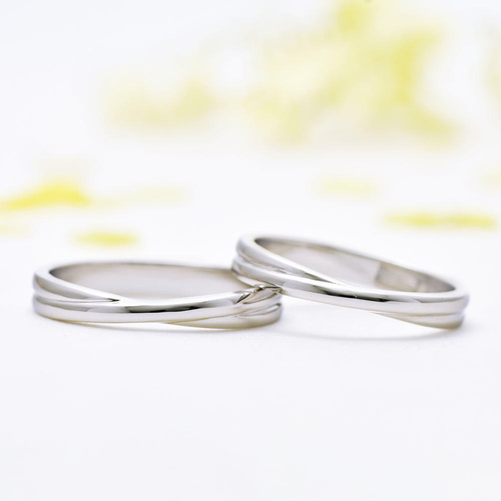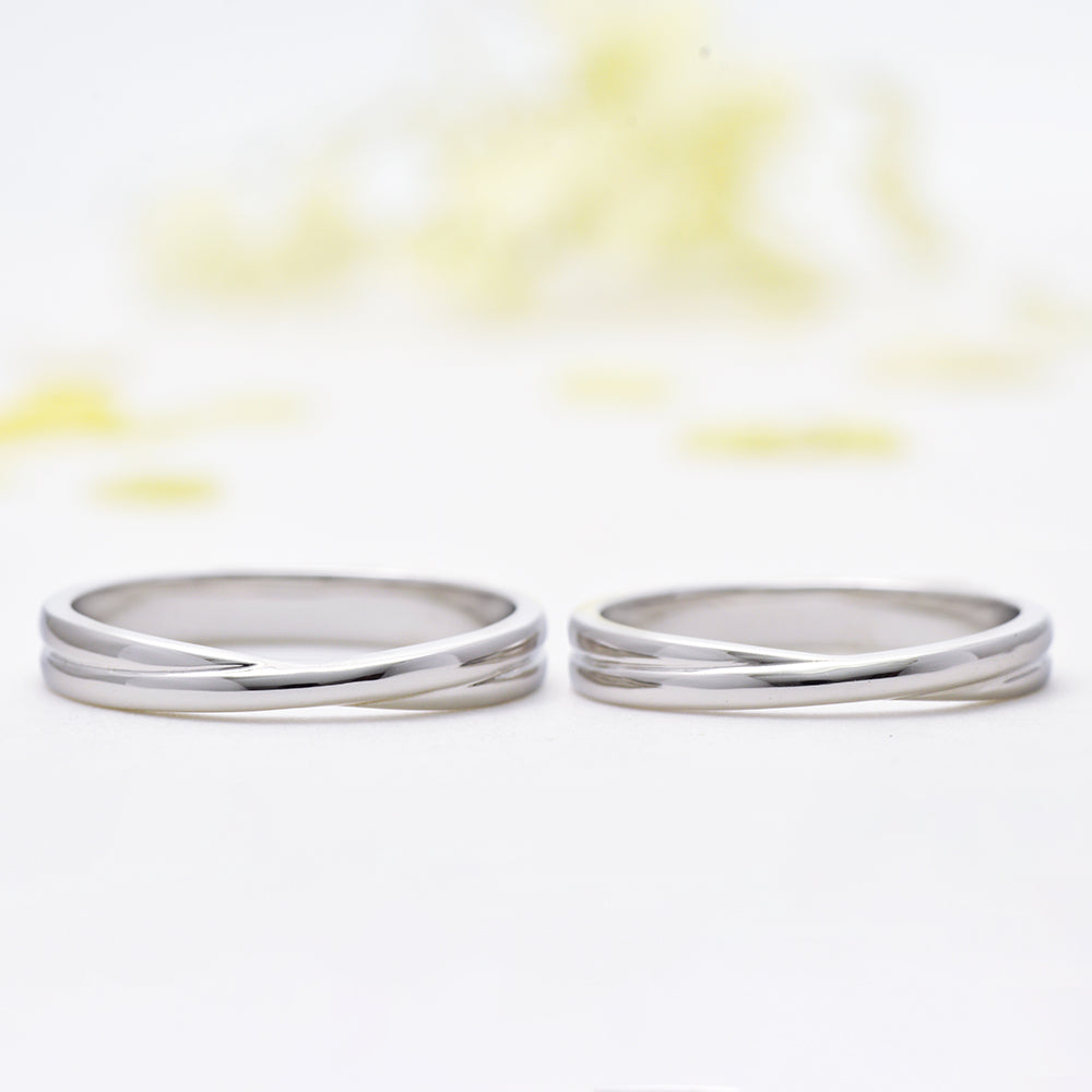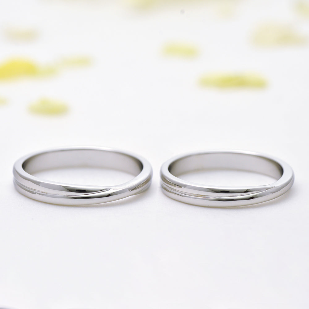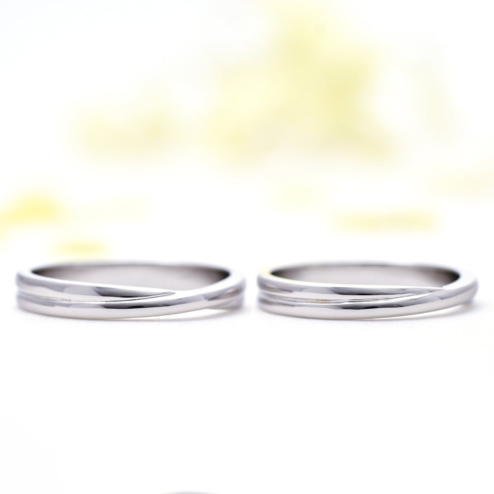 無限マークを折りたたんだようなデザインの結婚指輪。薬指に巻き付いた糸にも見えることからフランス語で 糸 を表すFil。途切れなく二人を結ぶ絆を感じるデザイン。中央が細くなっているので、華奢な印象になりGOOD。